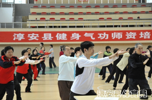 由淳安县体育总会、淳安县反邪教协会联合主办、淳安县健身气功辅导总站承办的淳安县健身气功师资培训班于4月9日上午在淳安体育馆举行。本次培训的内容是八段锦、五禽戏、养生导引十二法、太极导引功等四套国家体育总局审定推广的健身功法培训。
